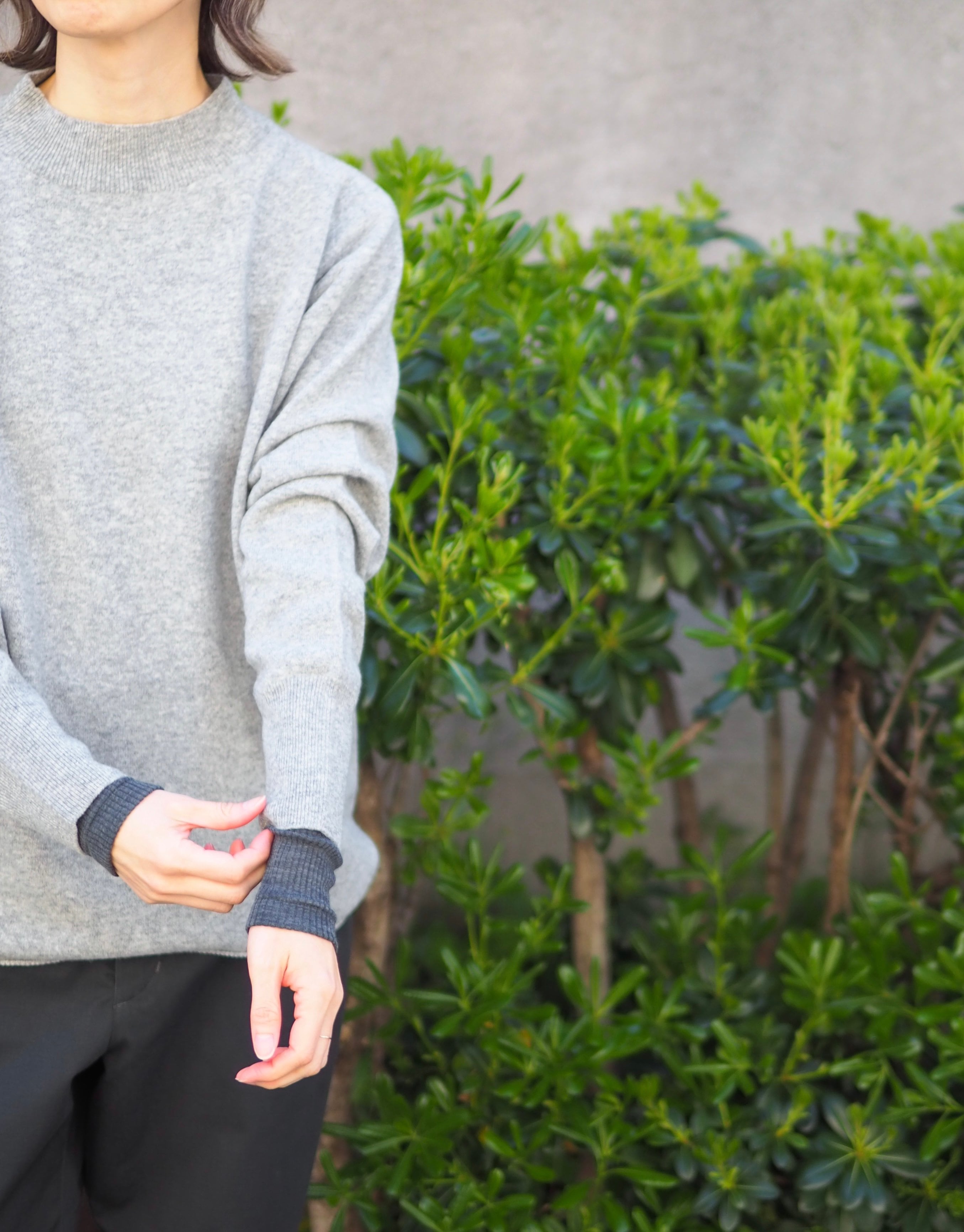 襟元のリブはミドル丈のシングルリブで、立ち上がりは浅めで柔らか、身体全体が優しく包まれる感じです。