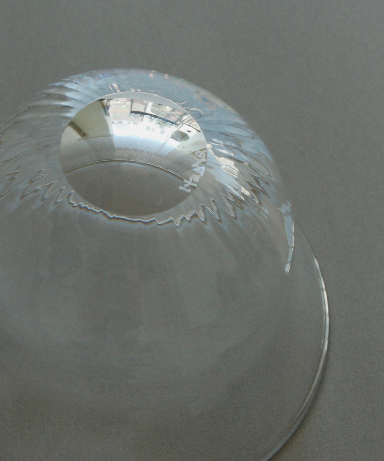 分厚いガラスに刻まれた繊細な線模様が、光の揺らぎを映し出す美しい器です。
