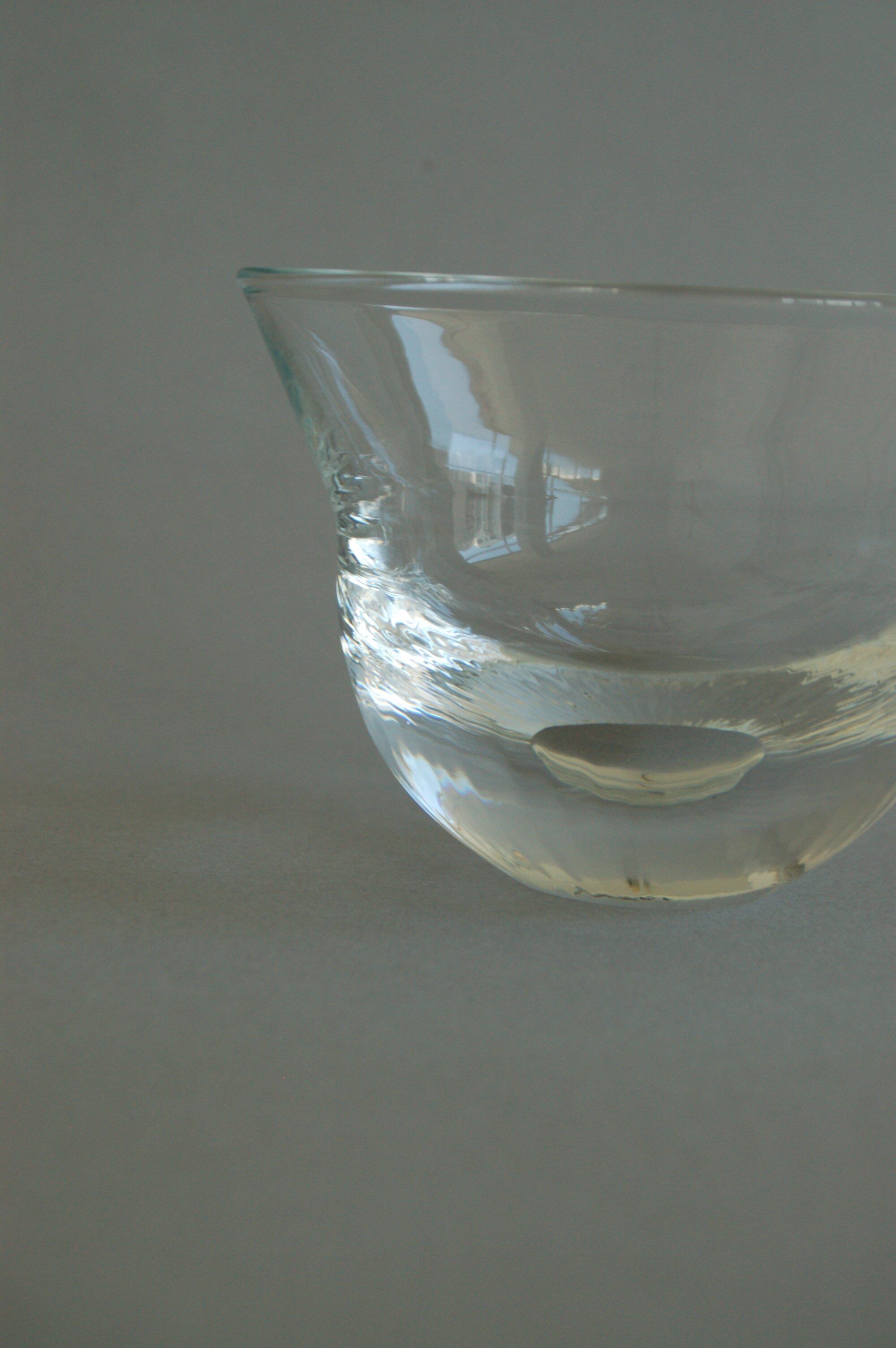「水線」と名付けられた広口鉢は、一見見過ごしてしまうような微かな細い線が器の下方に刻まれていますが、これは竿に巻き取った熱いガラスを水に浸けて生まれる線です。