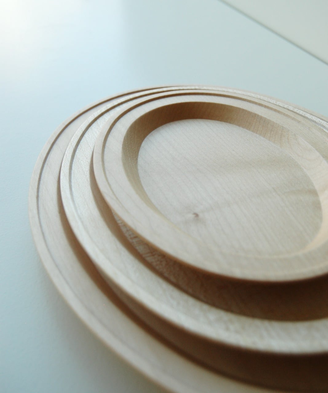 白色の硬いメープル材を使い、どこか陶器や磁器にもにた佇まいをシャープなエッジで表現しています。