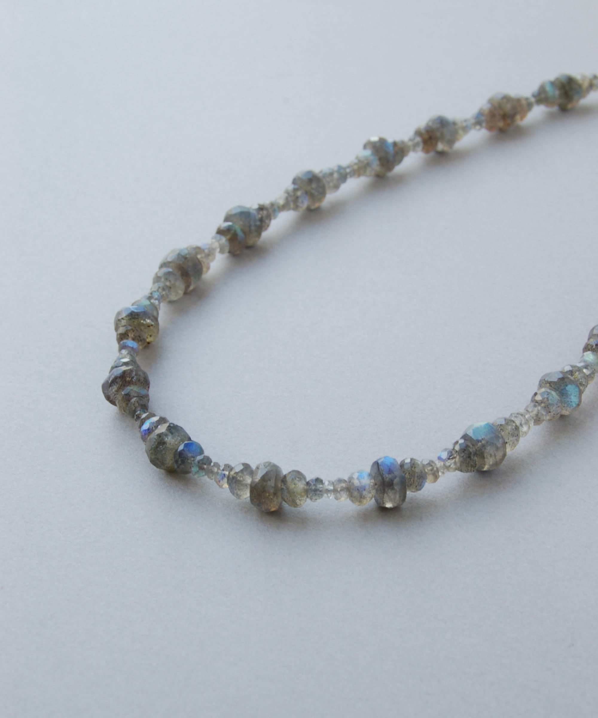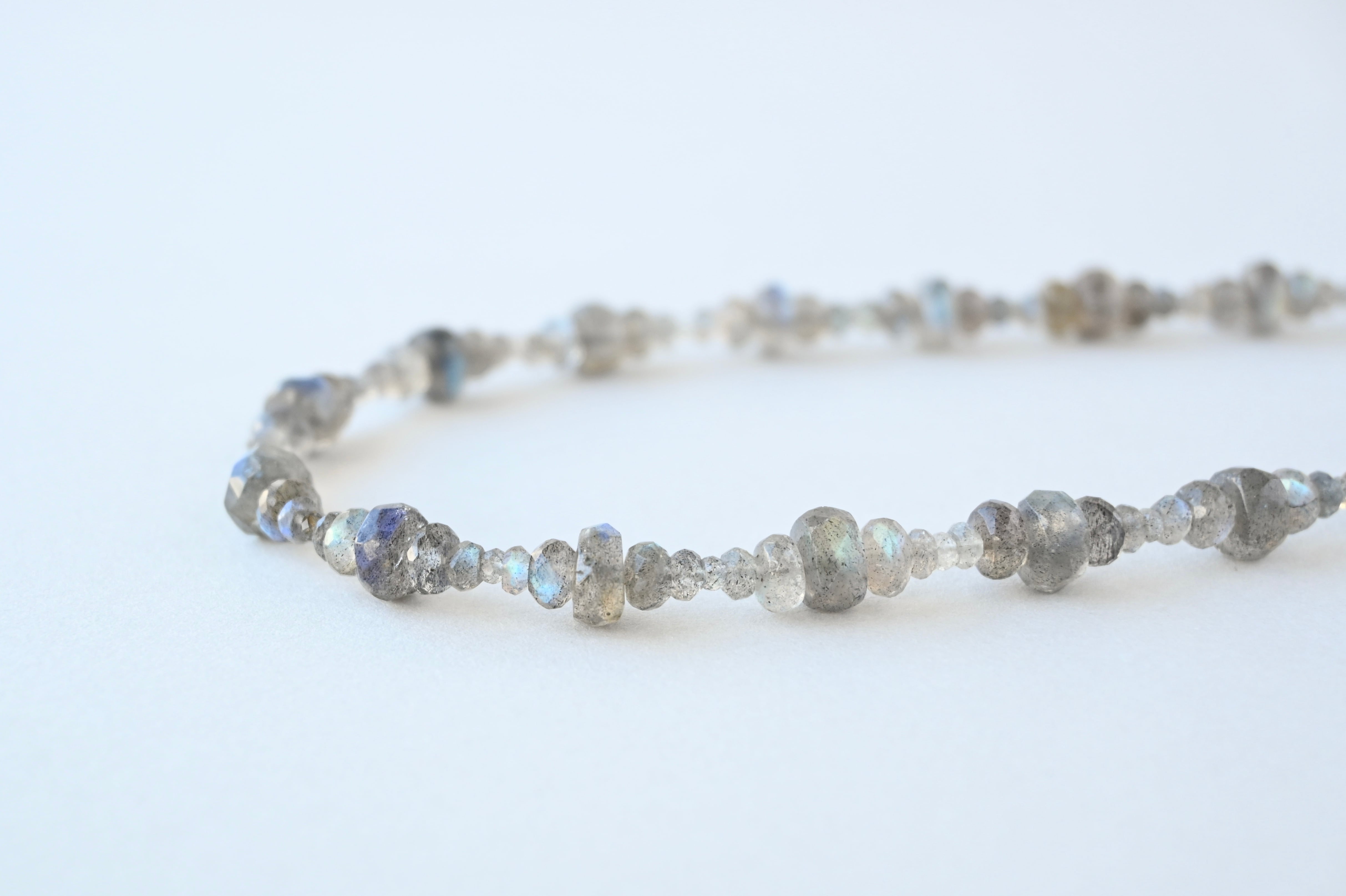 4種類のサイズが違うラブラドライトを組み合わせて繋げたネックレス。