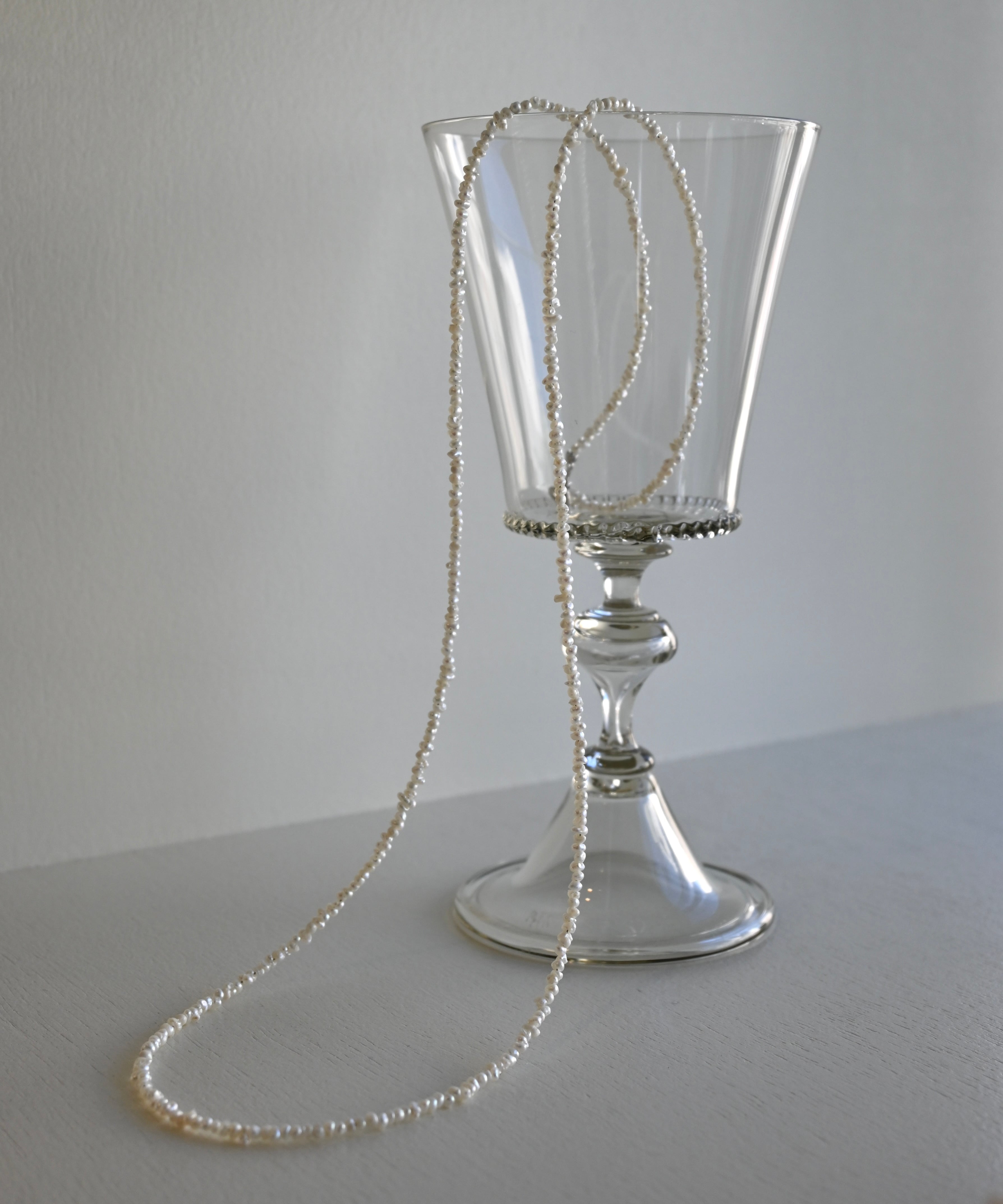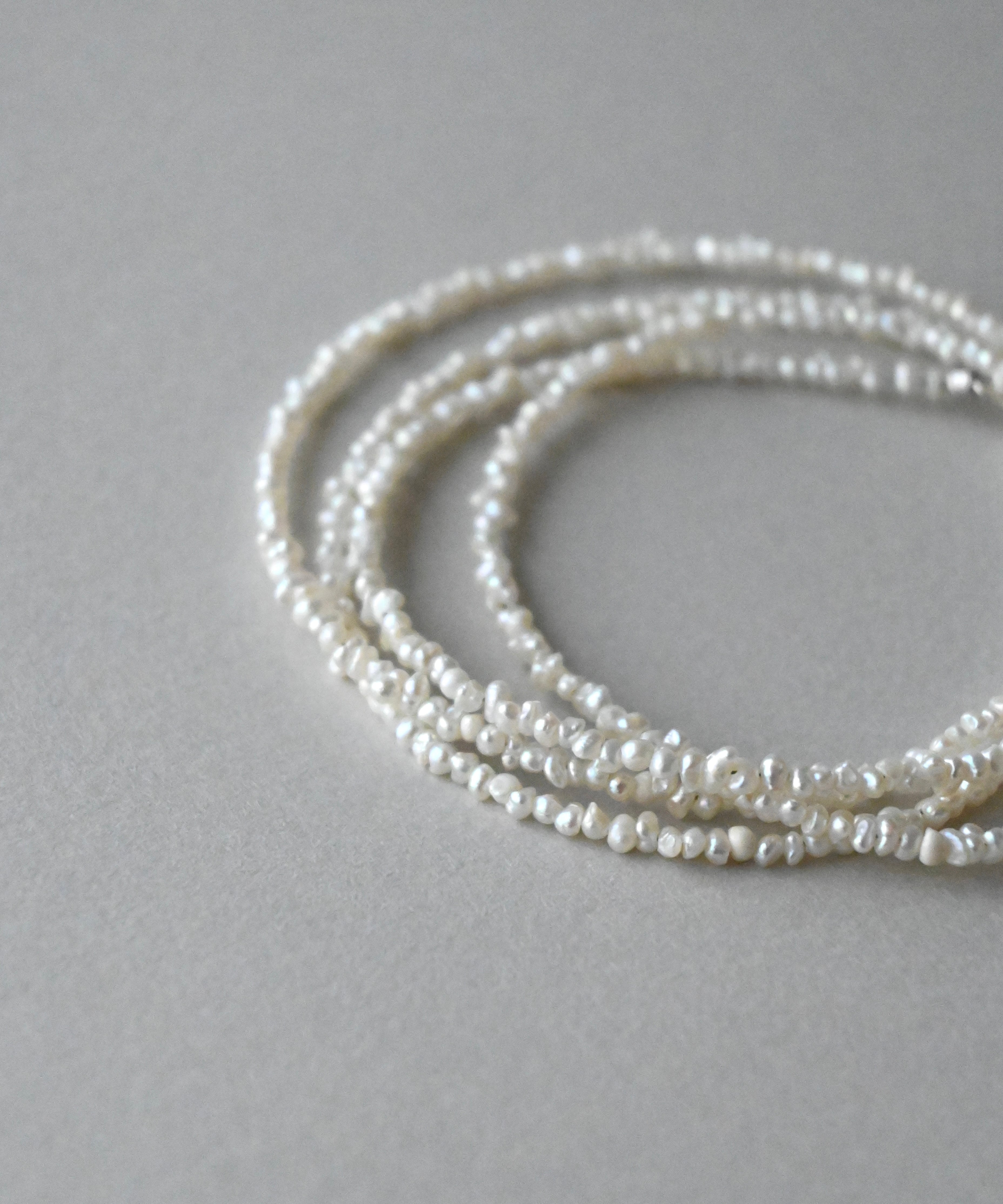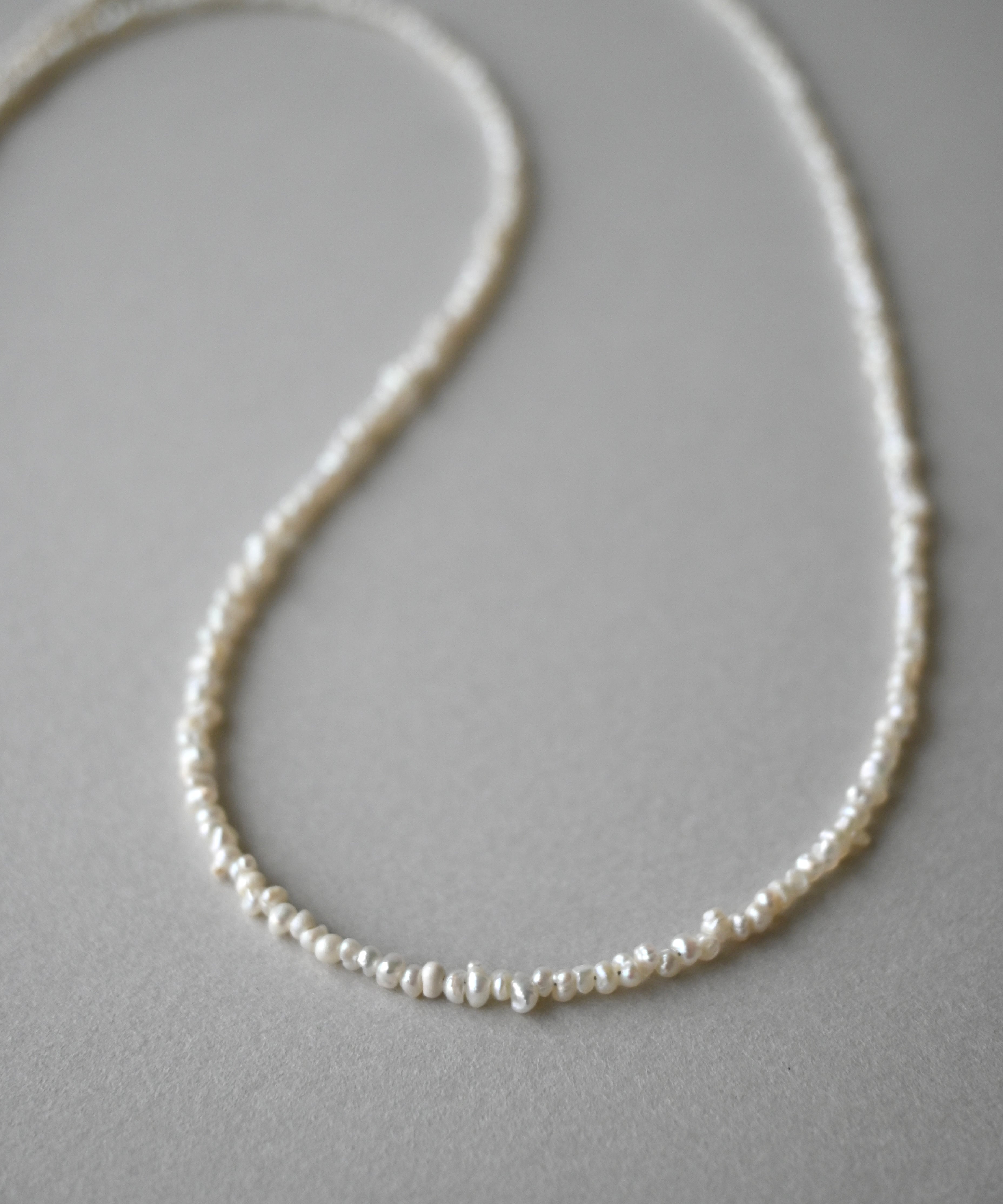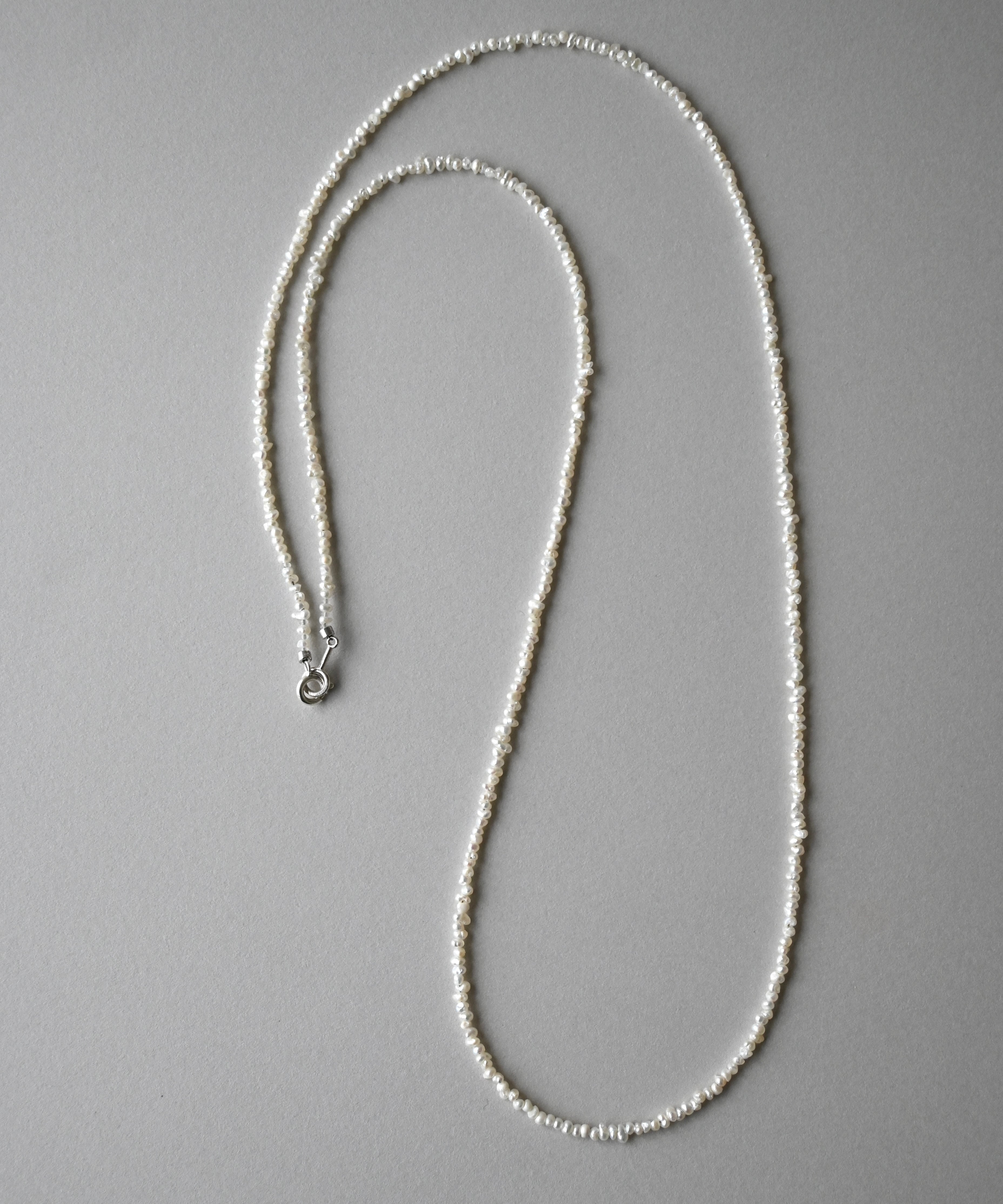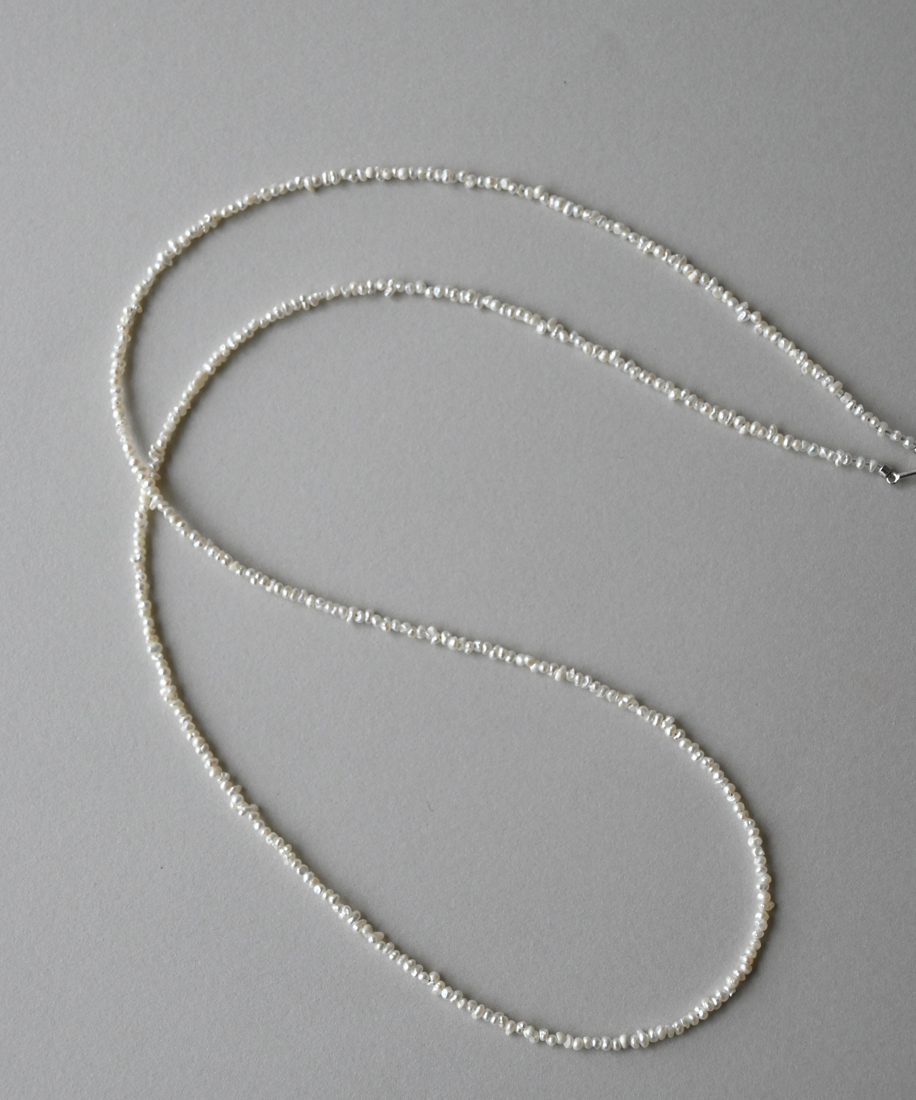 とてもしなやかで、美しい輝きをもつ極小パールネックレス。適度に不揃いなのがいいですね。さりげなくセーターやTシャツなどに。70cmの長さはおしゃれ感がアップします。その都度留め具を外さなくても被れる長さが楽ですね。柔らかいので、手首にクルクルッと巻いてブレスレットにしても素敵です。